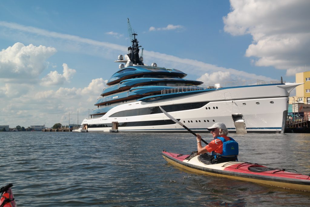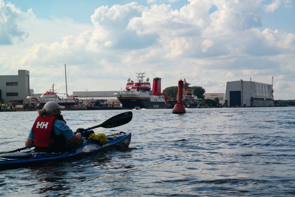 Die rund 30 Kilometer lange Strecke führte zunächst vorbei an den Werften in Vegesack. Schon hier gab es einiges zu sehen, doch besonders eindrucksvoll waren die großen Schiffe auf der Unterweser: Die Luxusyacht Deep Blue war ein echter Blickfang. Die 134,2 Meter lange Superyacht des deutschen Herstellers Lürssen Yachts wurde 2025 in Bremen gebaut und hat erst im Juni das Dock verlassen. Sie ist in fünf Decks aufgeteilt und bietet Luxusausstattung wie mehrere Pools, einen Schönheitssalon, ein Kino und ein Spa. Die Deep Blue gehört zu den größten Projekten von Lürssen und gilt als eine der größten Yachtlieferungen des Jahres 2025 weltweit. Neben ihr begegneten wir außerdem den bekannten Forschungsschiffen Meteor und Uthörn, die regelmäßig auf den Weltmeeren unterwegs sind. So dicht an den imposanten Rümpfen vorbeizupaddeln war für viele ein Highlight der Fahrt.